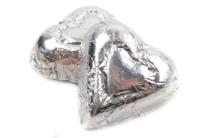 I wrapped heart-shaped chocolates for Valentine’s Day in December at the Schoolhouse Candy factory located in Pawtucket. The chocolates were wrapped in silver foil stamped with two red interlocking hearts pierced by an arrow. I worked from three until seven at night in a room lit by fluorescent lights hanging high from the ceiling. We all wore hair-nets and stood shoulder to shoulder at long wooden rectangular tables.